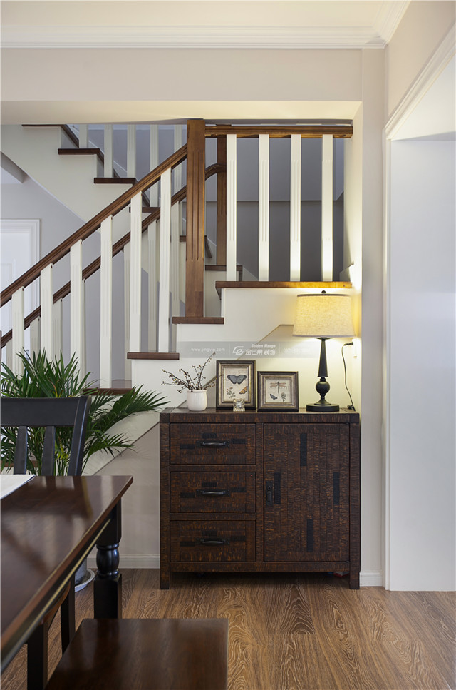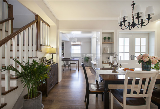 簡潔明亮的配色清爽明快,深色木地板突出質樸、優雅的感覺。美式的燈具增加濃厚的美式氛圍。