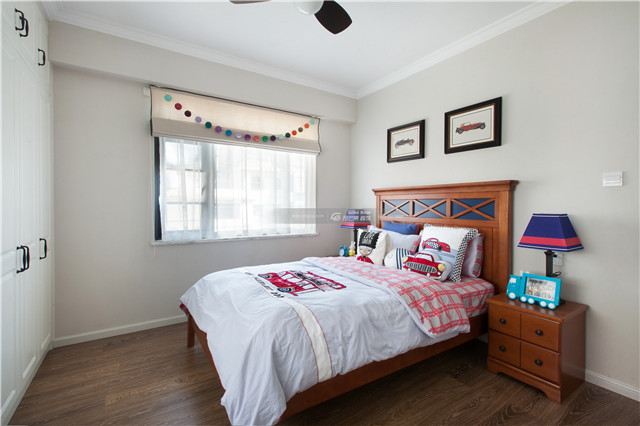 細節感滿滿的設計滿足整體風格的調性,可愛的卡通裝飾,富有美式氣息的床具、紅藍顏色搭配,讓孩子的小天地變得個性十足,溫馨感滿滿。