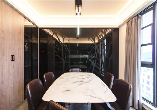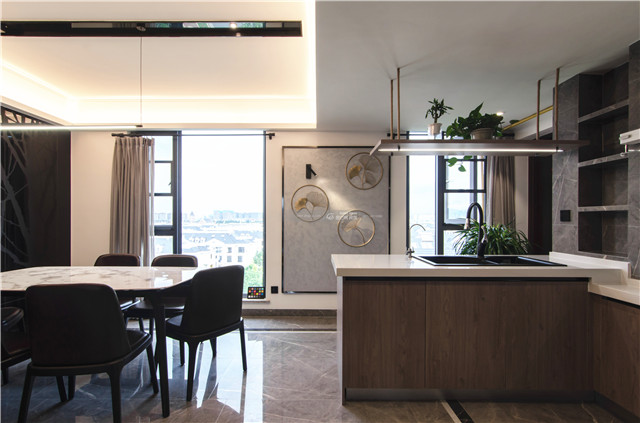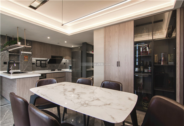 石材桌面搭配皮革餐桌椅,石材的高級和皮革的貴氣碰撞出奢雅高級的空間格調。