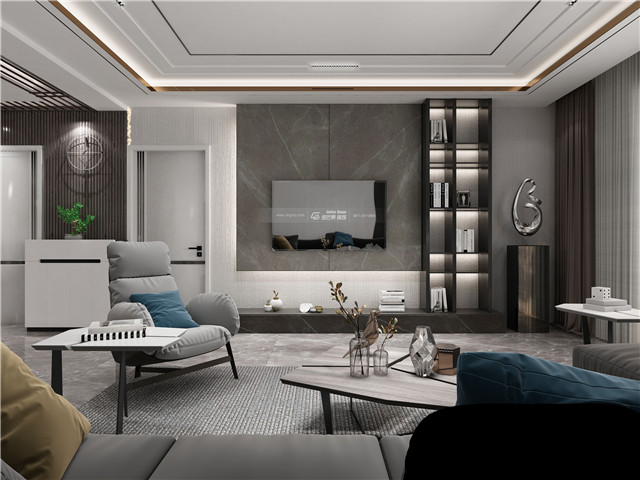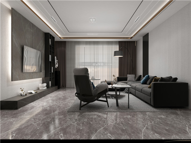 用顏色和材質(zhì)的搭配碰撞出豐富的層次感,石材的電視背景墻和地板,搭配現(xiàn)代舒適的布藝家具,營造令人放松的家居格調(diào),時尚感、品質(zhì)感兼具。