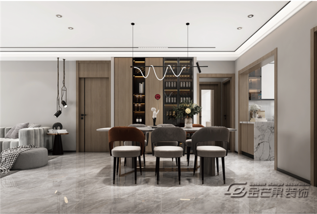 顏色彰顯高級(jí)的餐桌椅讓視覺(jué)有了重心,木材餐邊柜讓空間時(shí)尚又溫馨,個(gè)性的燈飾更顯時(shí)尚。