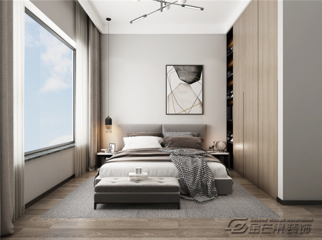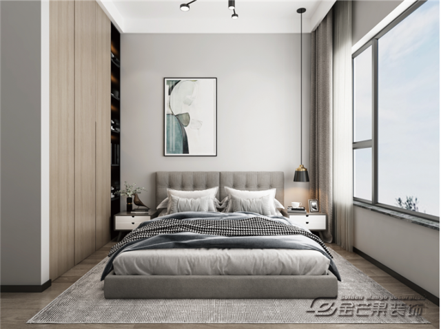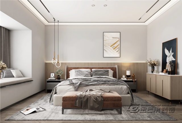 溫馨的木質(zhì)地板,白墻和木飾面,讓空間更有對(duì)比性,讓有格調(diào)感。精致的燈飾傳達(dá)不隨意、不敷衍的生活態(tài)度,大氣溫馨時(shí)尚的臥室空間。