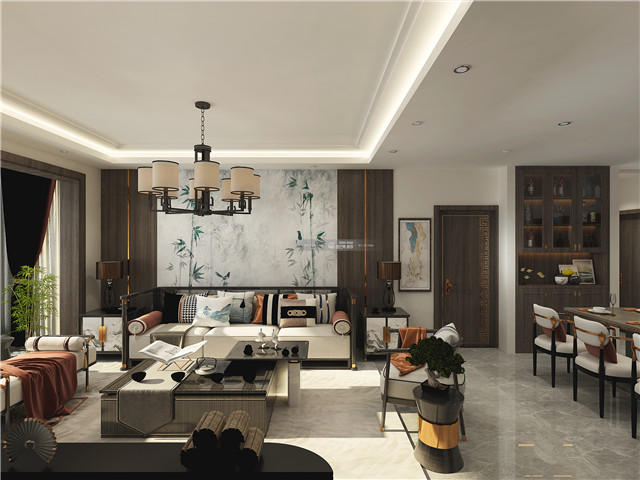 金屬的元素和典雅的木材結合起來,展現貴氣的中式風韻。餐邊柜更加彰顯中式的典雅之美。