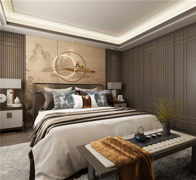 大氣尊貴的中式格調令人沉醉,中式的底蘊展現中式典雅貴氣的美感。床頭背景墻上的山水畫展現大氣深遠的意境,古雅的造型加上現代的材質,打造古雅和現代碰撞的美感。