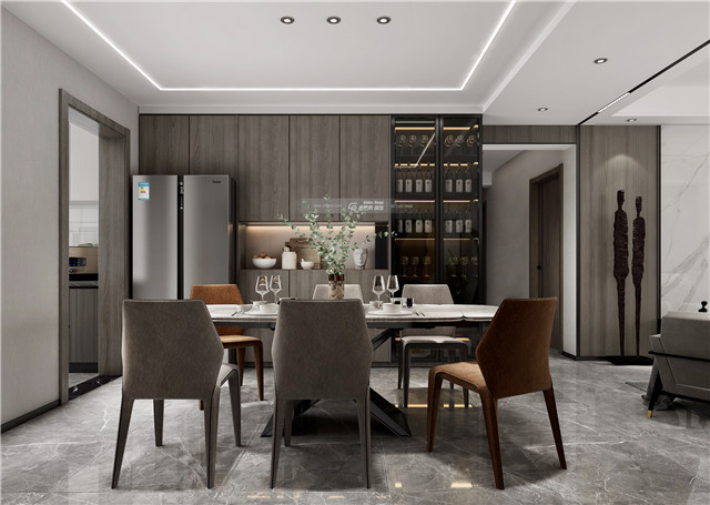 大氣有格調的餐廳,餐邊柜嵌入玻璃,精致的紅酒映射出奢華的光線,讓用餐變得高級充滿儀式感。