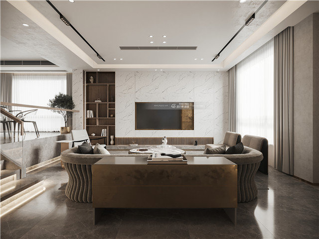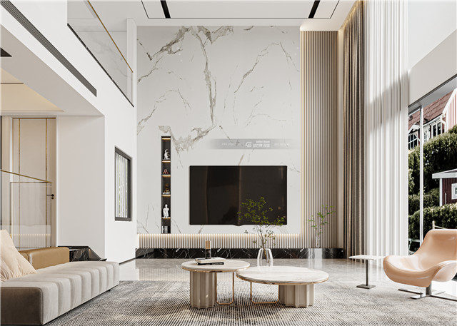挑高的大理石電視背景墻,搭配簡約白色,讓家呈現高級的空間感受,明亮的高大的落地窗,讓原本就開闊的空間變得更加通透。純凈的空間和大氣的設計語言讓家呈現高級品質感格調。