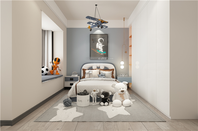純真可愛的兒童房,讓孩子的世界變得可愛而簡單,飛機(jī)狀的燈飾增加屋子的童趣。