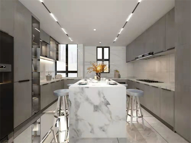 柜體設計,家電合理嵌入,在材質搭配下彰顯品質,再加上島臺操作方便,多人聚餐,美觀實用。
