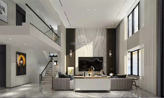 地面大理石材與電視背景石材墻板相呼映,大氣又不清冷,兩層樓梯石材踏步透明玻璃不銹鋼條,簡潔又利落。