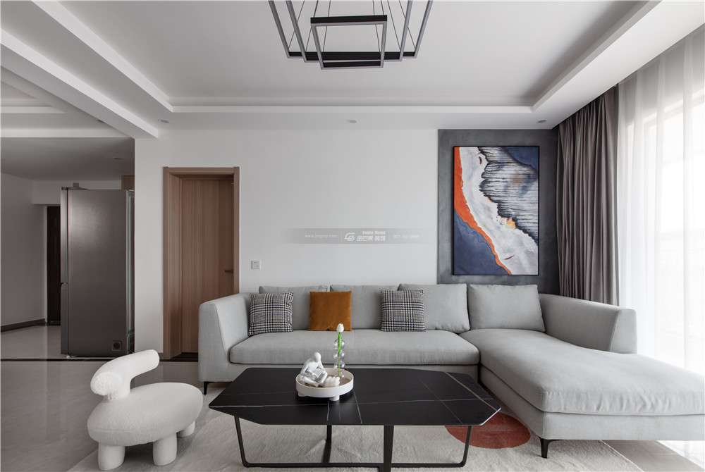 本套昆明裝修現(xiàn)代風(fēng)格案例采用現(xiàn)代風(fēng)格經(jīng)典色系黑白灰,白色墻體使空間看起來更加干凈通透,黑色小桌搭配灰色沙發(fā)加以淺灰色地磚,使整體空間更顯沉穩(wěn),搭配跳脫的裝飾畫,使空間更顯靈動。