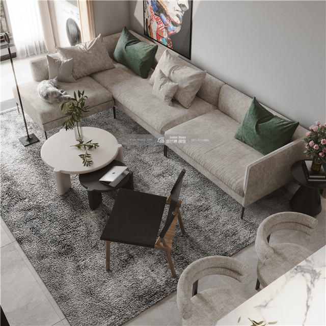 簡約的灰色,不同層次的鋪展開來,醞釀高級而豐富的層次。墻面的灰度讓空間變得富有高級感,灰色地毯承載溫厚的空間溫度感,棉麻的沙發讓空間變得更加文藝和細膩。