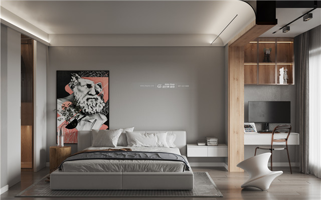 灰色和黑色搭配的顏色顯得冷硬而富有格調,弧形的設計和木飾面增加溫暖感。空間的設計上富有設計造型感。裝飾畫和整體營造冷酷有格調而又不失溫度的空間感受。