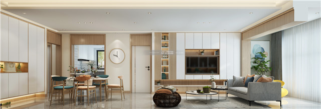 開放的客餐廳設計,讓空間更顯靈動和肆意,空間互動性更強,讓房間更顯溫馨。電視背景墻設置成柜體增加收納,內嵌電視增加功能性,讓電視背景墻簡潔收納和美觀。
