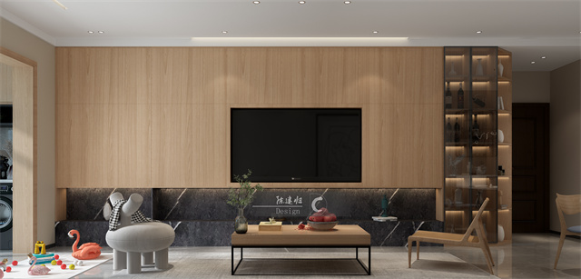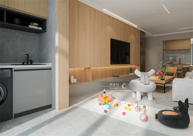 原木色電視背景墻,隱形的柜體一體式設計,干凈利落,加之電視位置的視覺調節、可愛簡潔的家具、溫柔的配色,溫馨又舒適。
