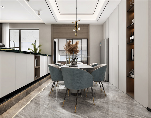 開(kāi)放式客餐廳形成良好的空間互動(dòng),優(yōu)雅的淺藍(lán)色椅子讓清新感撲面而來(lái),整個(gè)家居變得溫柔而輕松,餐椅的造型也讓用餐空間變得更加精致起來(lái)。