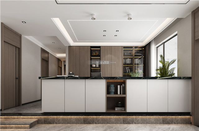 辦公休閑區(qū)設(shè)置臺(tái)面,既可以作為桌子、吧臺(tái),又可作為餐邊柜兼具儲(chǔ)物功能,同時(shí)起到隔斷的作用,美觀和實(shí)用兼具。