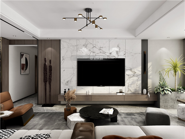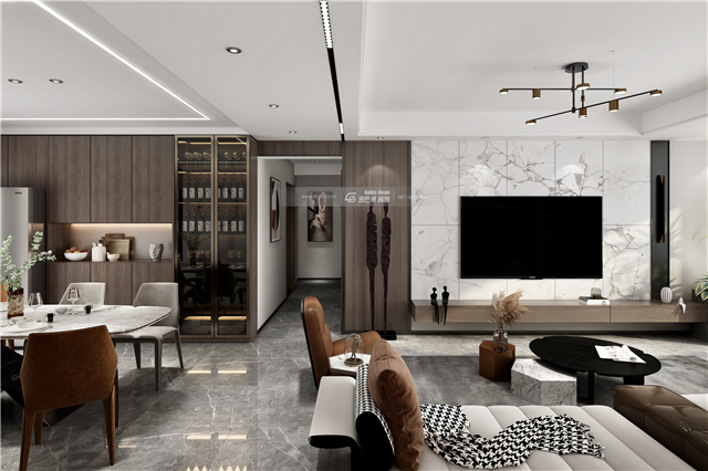 電視背景墻用大理石材增加空間高級感,石材花紋讓空間變得更加有意境和優(yōu)雅。大量的木材的運(yùn)用增加溫暖感,搭配金屬玻璃的酒柜,時尚感滿滿的同時,家的舒適度也彰然顯現(xiàn)。