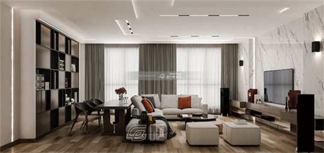 在客廳的設計上大膽運用軟裝和硬裝的結合,營造舒適、寬敞的體驗。地板材料使用木質的地板,更加有品質,在實際的使用體驗上也有強烈的反饋。舒適的休閑沙發也是疲倦時的一大支撐,大理石的電視背景墻更顯雅致、美觀。四個音響的配置,享受著影音的最大魅力,落地窗在整體寬敞、明亮的這一感受中顯得尤為重要,美觀實用的燈帶代替主燈設計。
