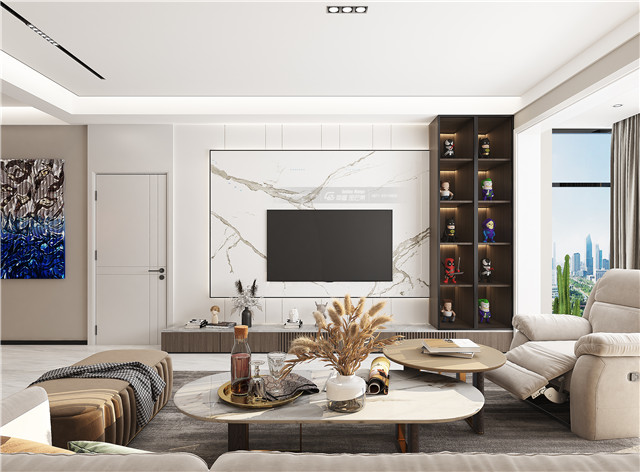 大理石花紋電視背景墻,展現藝術感和優雅感,騰出一部分空間來放手辦,把自己的愛好融入到家居生活中。個性又自由的空間氛圍。
