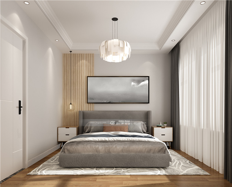 臥室整體以淺灰色為主色調,搭配原木色的地板和簡單的木質布藝軟包大床和簡單的床頭柜,體現出溫馨舒適的感覺。灰色與橘色搭配的撞色窗簾給臥室增加的時尚感。