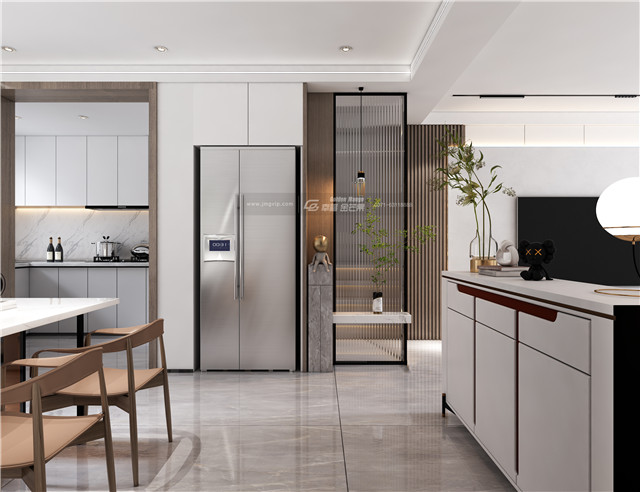 簡潔的造型讓空間顯得更加自由,棕色的椅子變得增加溫暖感,金屬加大理石餐桌增加輕奢感。裝飾畫營造可愛溫馨的空間氛圍。