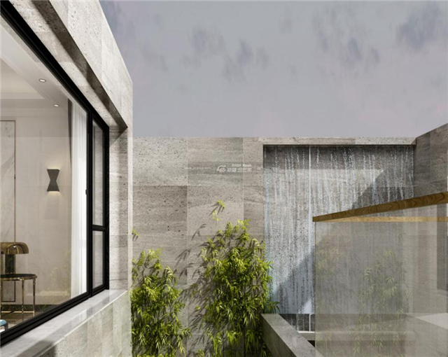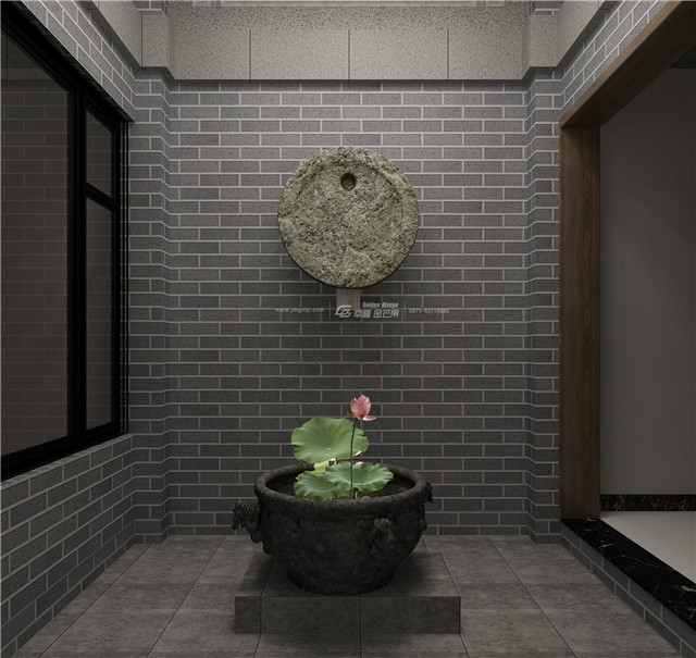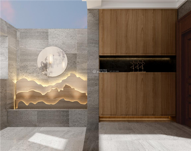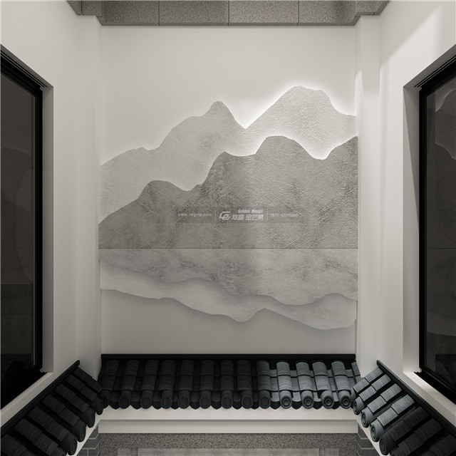“壁間水墨畫,為爾拂塵埃。”水墨畫仿佛和大理石墻面融為一體,揮毫幾筆,東方禪意全出。