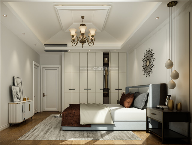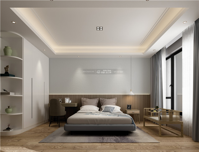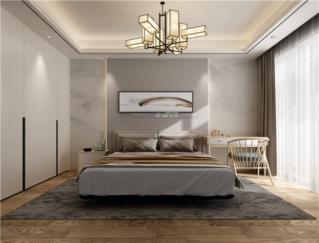 臥室充滿俊雅的味道,與空間整體用色保持一致。在配飾的選擇方面更為簡潔。整體柔和、沉穩和安靜,呈現出寧靜雅致的氛圍。同時輔之細膩的色彩處理與周到的材質轉換。