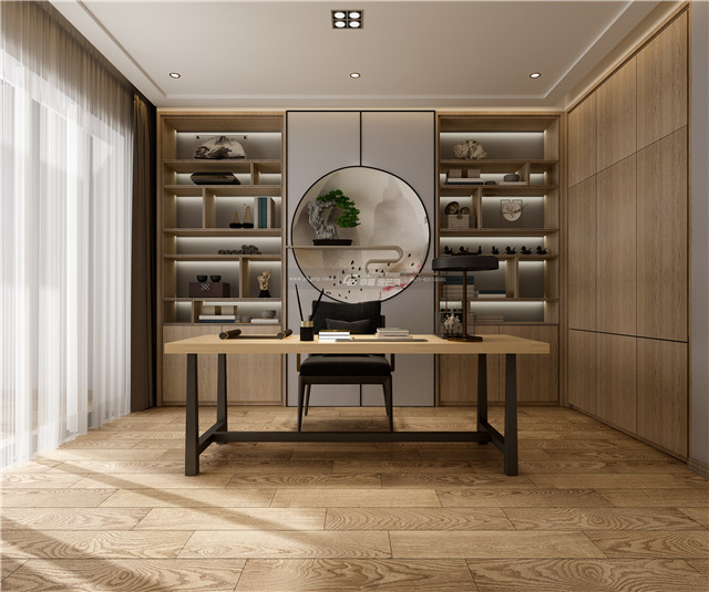 從現代的元素里面尋覓了顏色、材質,通過東方禪意美學的組合,將喧囂張揚的明黃原木與水墨重組,為書房的沉靜空間提了亮。