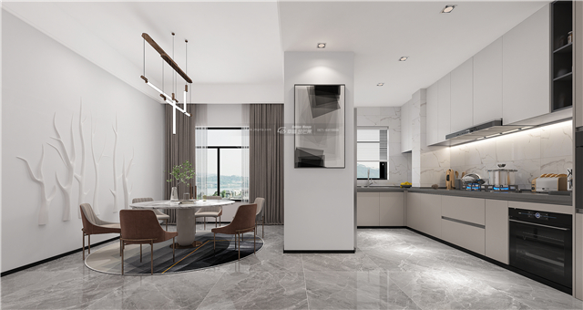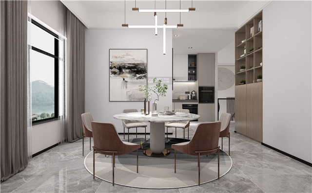 藝術感裝飾畫讓空間時尚度提升,廚房洗切炒動線流暢,一氣呵成。淡淡的大理石花紋寫意氛圍十足。餐廳選用儀式感滿滿的圓桌,搭配精致的地毯,格調感滿溢。