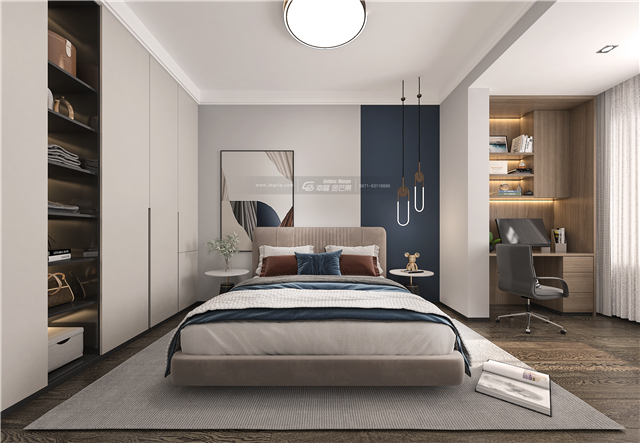 暗藍的配色營造一種高級感空間氛圍,留出一個休閑辦公的區(qū)域,增加功能性。木材顏色較深,和暗色墻面結合,形成一種沉穩(wěn)、安心的空間氛圍。