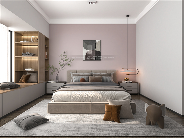 暗粉色的墻面少女感十足,同時醞釀空間的優(yōu)雅氛圍。加上一縷植物,清新又純粹的感覺。飄窗選用木材,加上溫暖的燈光,更增加溫暖感。