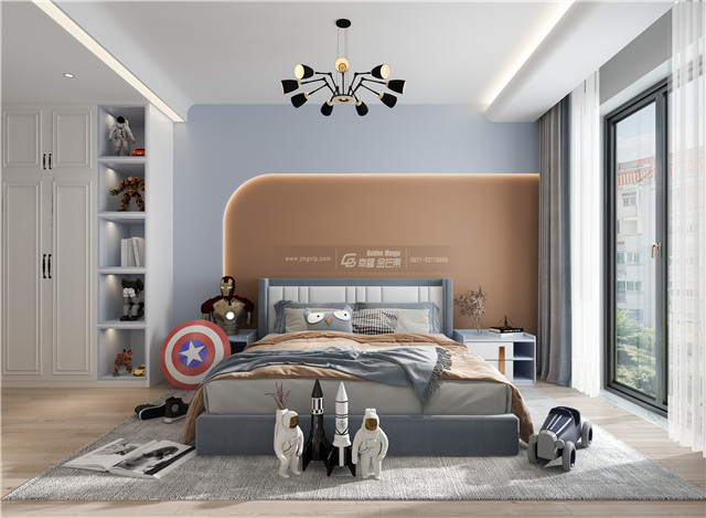 床頭背景墻是一整面的動漫人物,充滿無限的想象力和創(chuàng)造力,不斷突破桎梏,孩子的未來擁有著無限的可能。