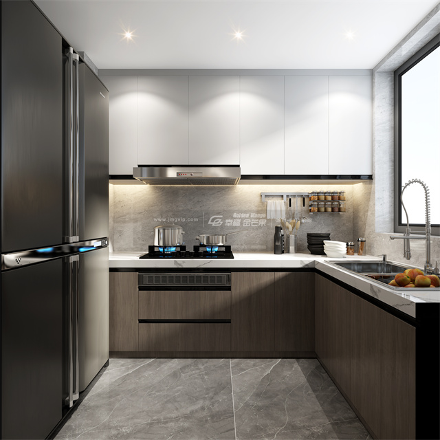 廚房定制了整體櫥柜以保證視覺上的整齊,咖色+白色的組合低調(diào)沉靜,恰到好處地賦予空間以溫度。筒燈與隱藏?zé)魩Ч餐瑵M足著烹飪時(shí)的不同照明需求。