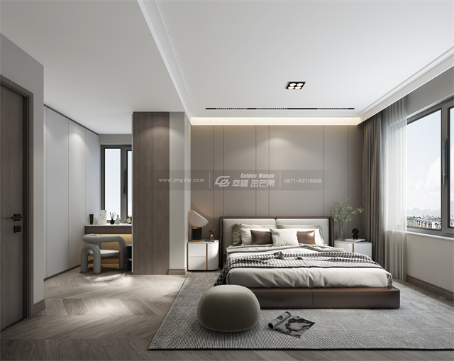 回歸私密空間,沉穩(wěn)細(xì)節(jié)的硬性元素占主要比重,張弛有度的主臥空間被色彩和質(zhì)感馴服得松弛和靜謐。墻邊的衣柜加入了梳妝臺(tái)的功能,整個(gè)空間設(shè)計(jì)連貫統(tǒng)一,讓空間顯得更加簡(jiǎn)約舒適。