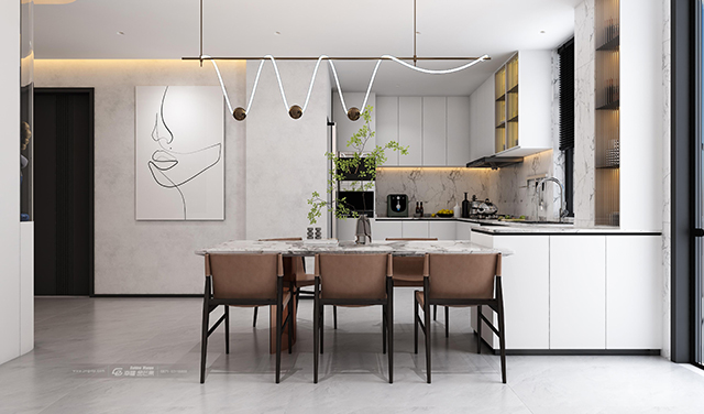 本案是一套143平的現代簡約風案例,以靈活實用為主旨,根據居住者的行為尺度優化生活動線,設計全開放客餐廚區域。