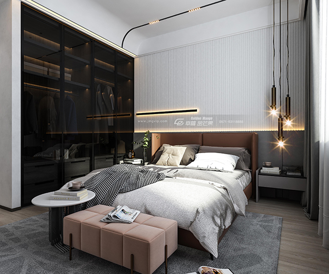 臥室整體簡潔灰的空間,從墻面、窗簾、床單的硬裝與軟裝都采取簡約灰的設計,使得空間趨于簡單舒適為主。