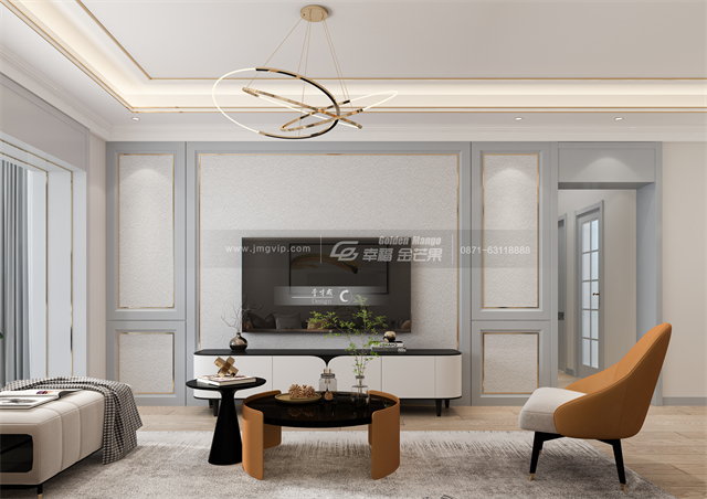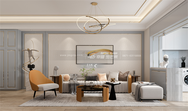 浪漫邂逅開場,如同故事的序章。整個客廳空間,藍(lán)色+白色的主旋律,細(xì)膩溫潤的色澤在低灰度與飽和度的色覺暈染下呈現(xiàn)著優(yōu)雅脫俗的超凡氣質(zhì)。灰藍(lán)色背景線條調(diào)性低奢,灰色沙發(fā)融合橘色點綴,演繹出一種“低調(diào)的奢華”,令空間質(zhì)感更為飽滿。