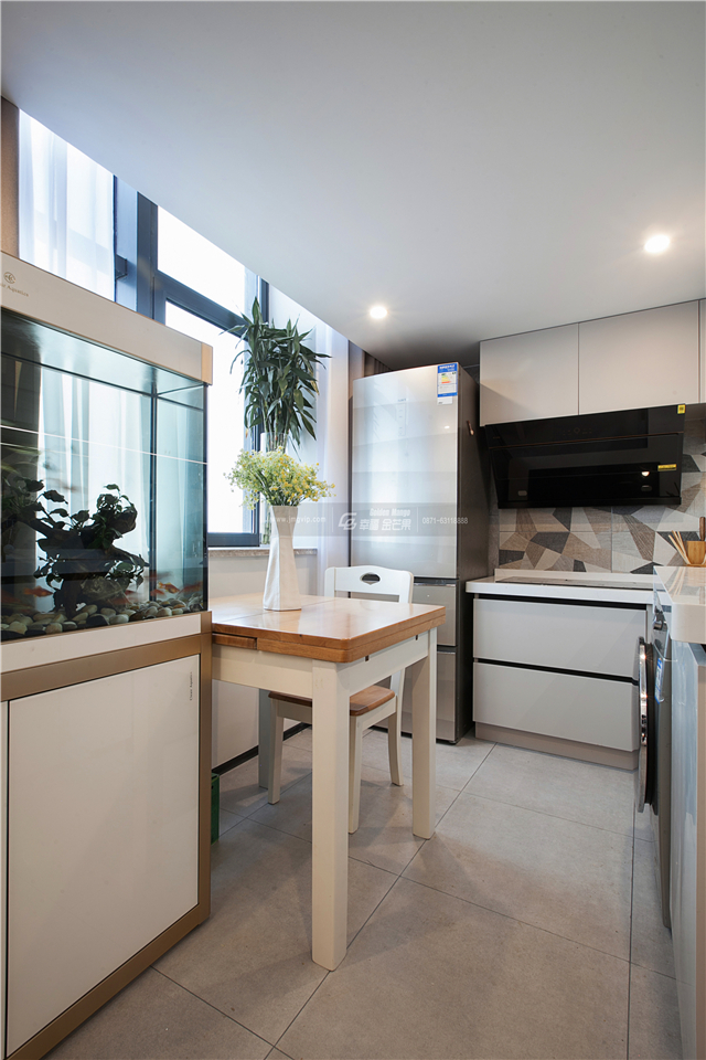 一個(gè)精致的廚房,生活便多了許多的味道。廚房空間有限,量身打造的操作臺(tái)剛好放進(jìn)冰箱,定制的吊柜更加節(jié)省空間。墻磚點(diǎn)綴的花紋讓廚房空間變得可愛(ài)起來(lái)。
