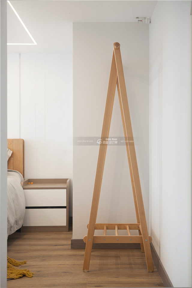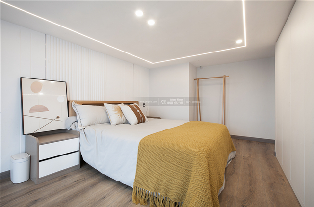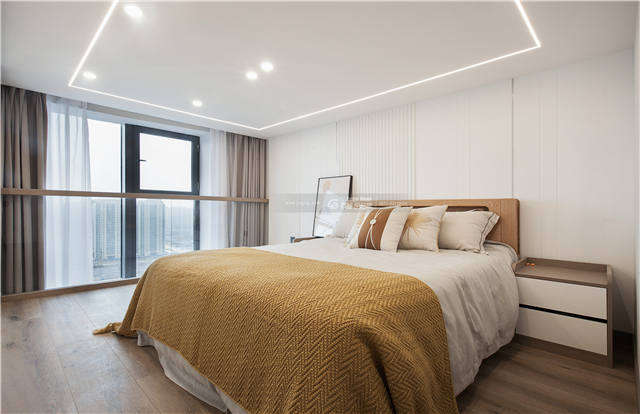 除了簡(jiǎn)單的色彩底蘊(yùn),空間的材質(zhì)則以輕盈溫柔為主,不疊加過(guò)多元素,自然彰顯空間的溫柔和放松。木質(zhì)的地板,暖黃的色調(diào),蓬松的床品,柔和的燈光,自然而然展露入睡空間的愜意和安逸。