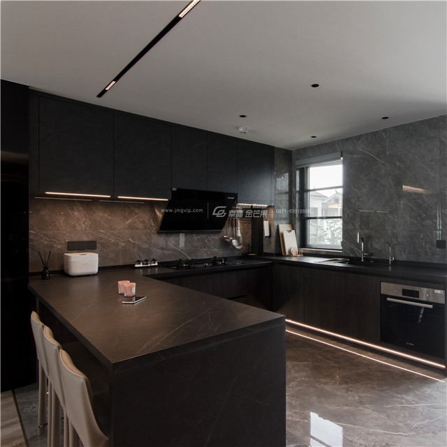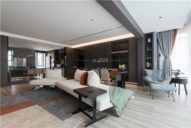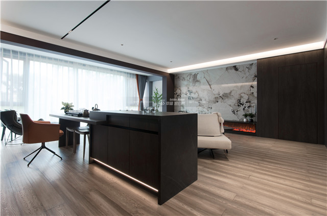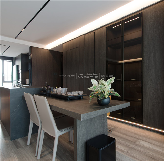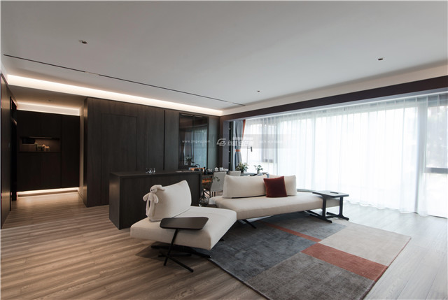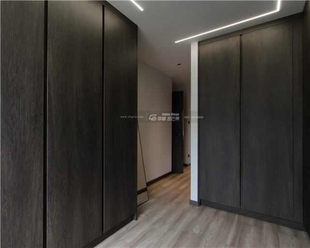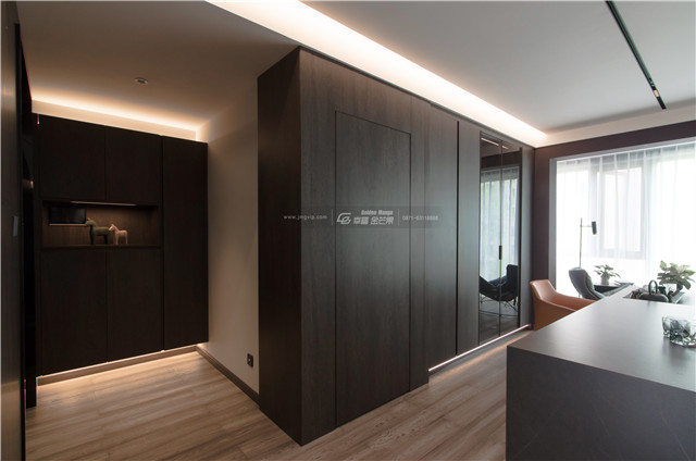 門、矮柜、門套選用高級整木定制,大面積定制柜體和墻板,便有了呈現(xiàn)出來的顏色和諧統(tǒng)一的效果,空間感更佳。