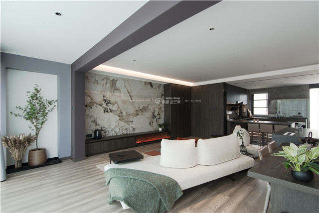 客廳的大落地窗,是明先生的最愛。將原結(jié)構(gòu)的陽臺推門拆除,按照室內(nèi)的最佳視野定做了落地窗玻璃的尺寸,如一個天然相框般框出室外畫,變幻著昆明四季的美景。