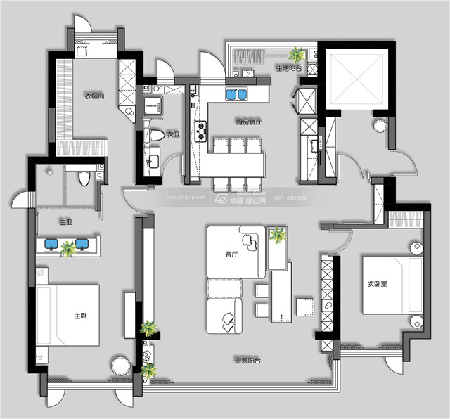 陽臺門套做跳色處理,空間色彩更加豐富了起來。