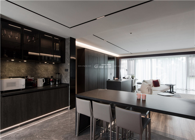 享受獨處帶來的安逸舒適,明先生也喜歡幾多好友聚在一起聊天交心的時光,于是客廳里就有了這個茶桌和調(diào)酒臺。中式茶韻,西式情調(diào),滿足明先生不同的社交方式。