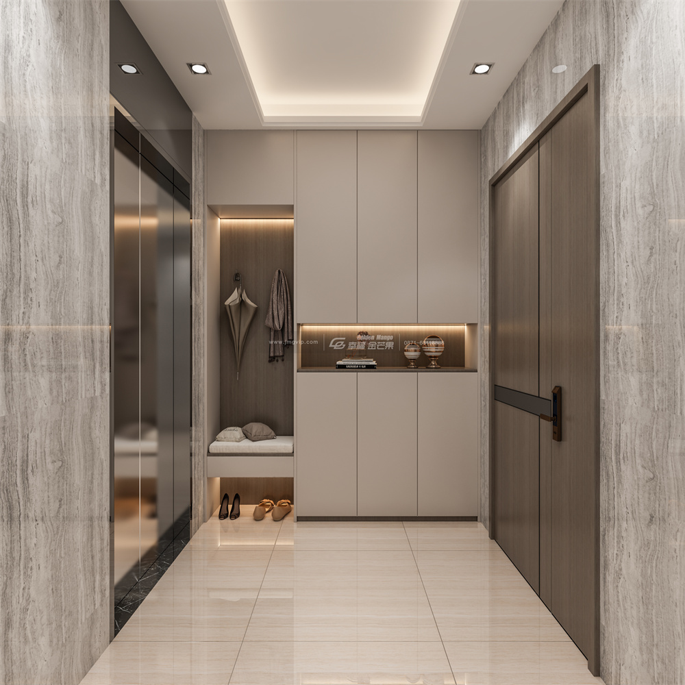 該案電梯出來就設(shè)計(jì)了一個(gè)戶外的換鞋區(qū)。大地色系在美妝領(lǐng)域經(jīng)典流傳,運(yùn)用到家居領(lǐng)域同樣也能令人印象深刻。