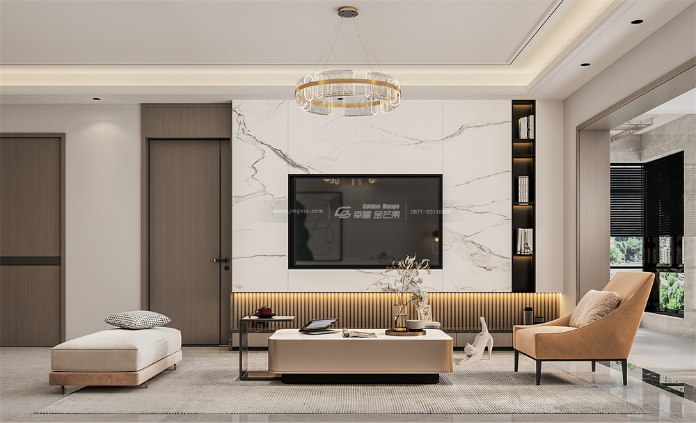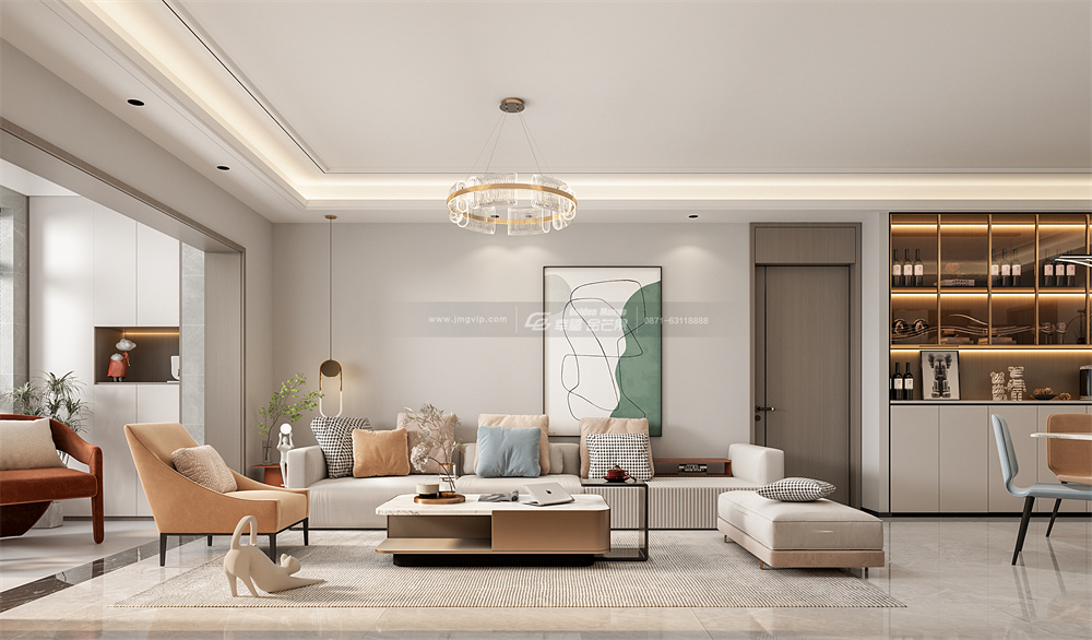 客廳是時(shí)尚與藝術(shù)的緊密結(jié)合,簡(jiǎn)化流暢的線條在視覺上令空間顯得更加通透、清爽,圍合式的沙發(fā)布局有效提高家庭親密度。