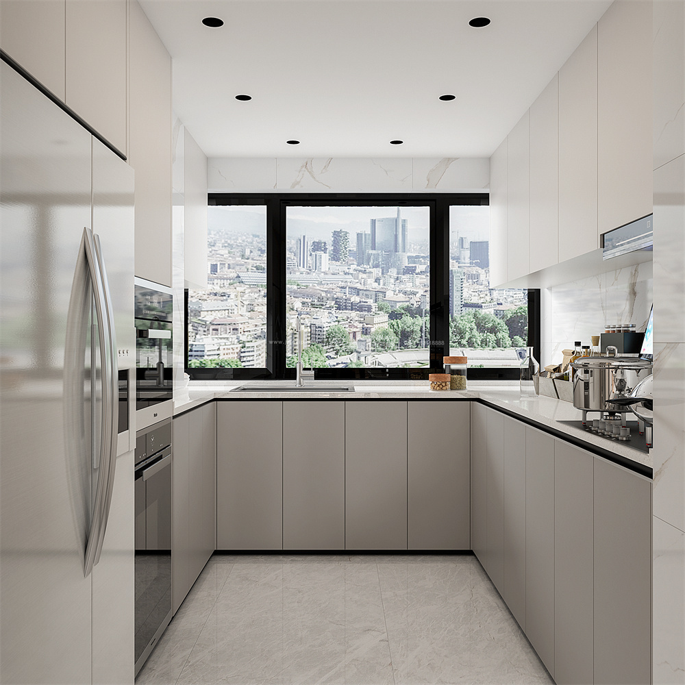 臺(tái)面整潔、廚房電器齊全,白灰的色彩搭配令空間多了一份高級(jí)。U型的布局也讓日常烹飪更便捷,不必來回走動(dòng)。