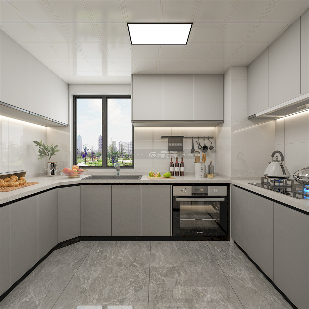 廚房以灰、白為主,地磚和柜門采用同一色系,具有良好的銜接效果。干凈的白色和穩(wěn)重的灰色相搭配,顯得廚房干凈利落,現(xiàn)代感十足,給人以視覺上的完美感受。