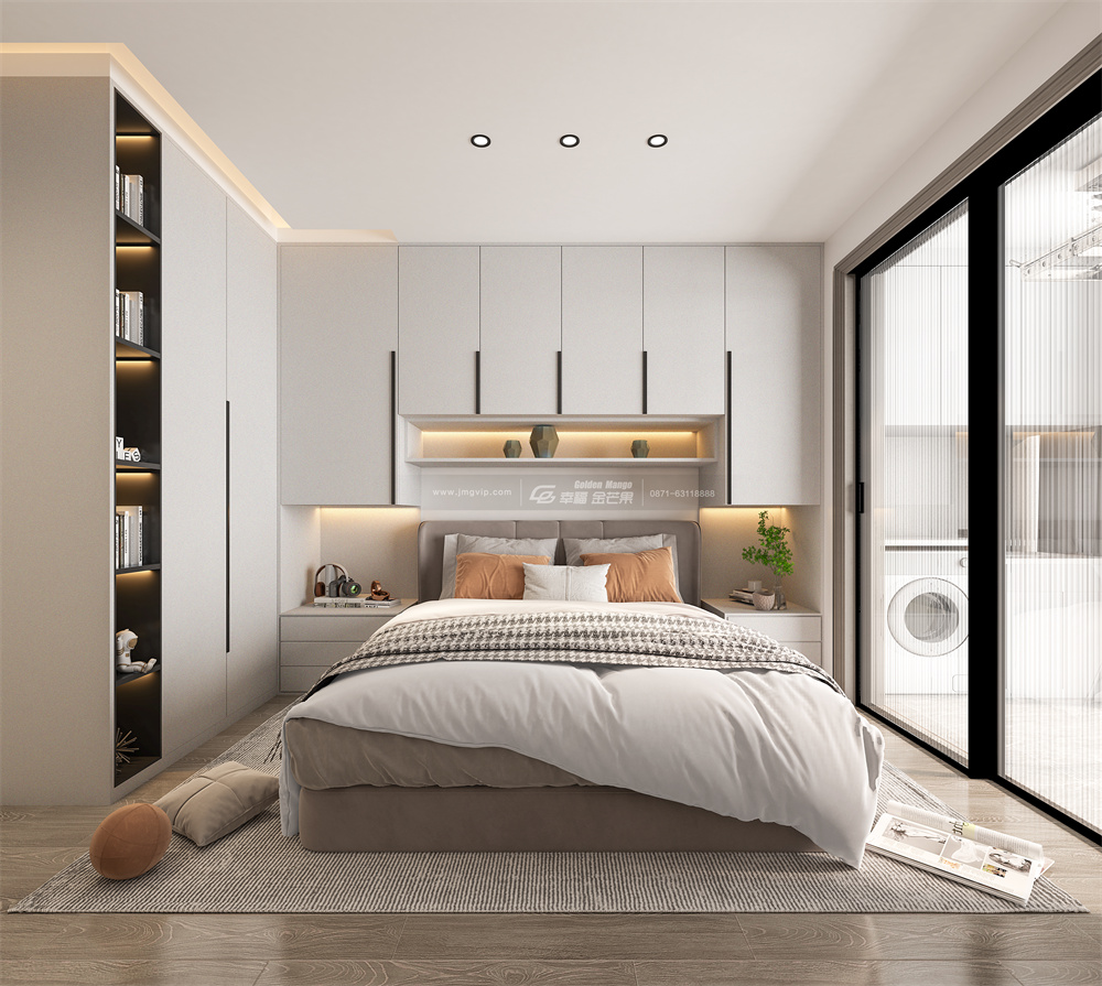 臥室采用一體化床頭設(shè)計(jì),擴(kuò)大了收納空間。床頭兩邊充當(dāng)床頭柜,在開放式格子中嵌入暖光燈帶,讓空間看起來更溫馨大氣。
