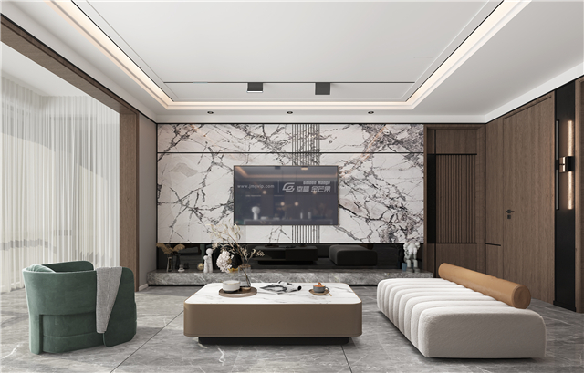 大理石電視背景墻,華麗的花紋暗藏一種低調(diào)的奢華。寬大的大落地窗,潔白的窗簾將光線引入室內(nèi),清透的格調(diào)加上華麗的家具,空間變得明媚動(dòng)人。