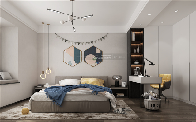可愛(ài)而活潑,通過(guò)配色和裝飾的改變,活潑的裝飾,有趣的造型,明媚的氛圍,空間特色突出,頗具個(gè)性,而又慵懶輕松,營(yíng)造適合舒睡和空間功能性較強(qiáng)的氛圍。